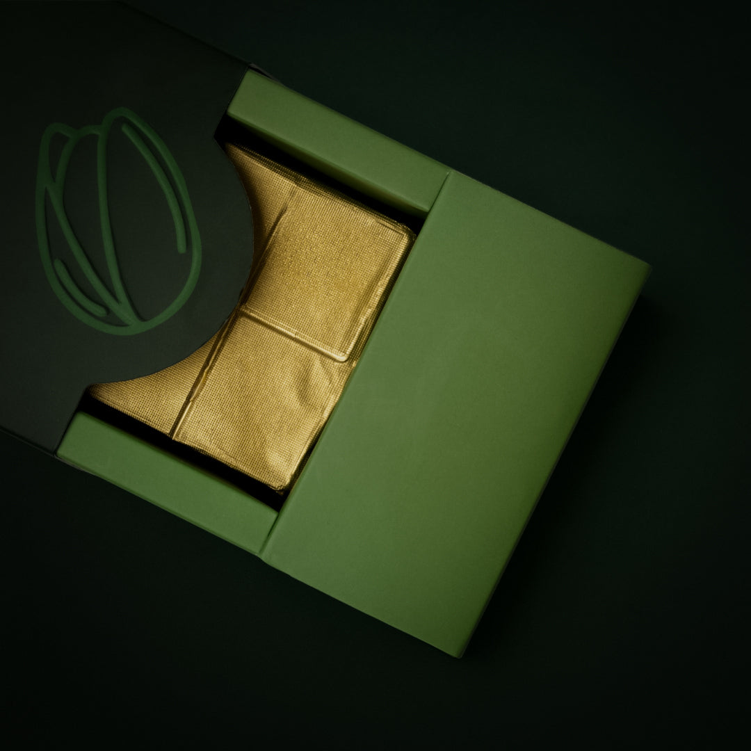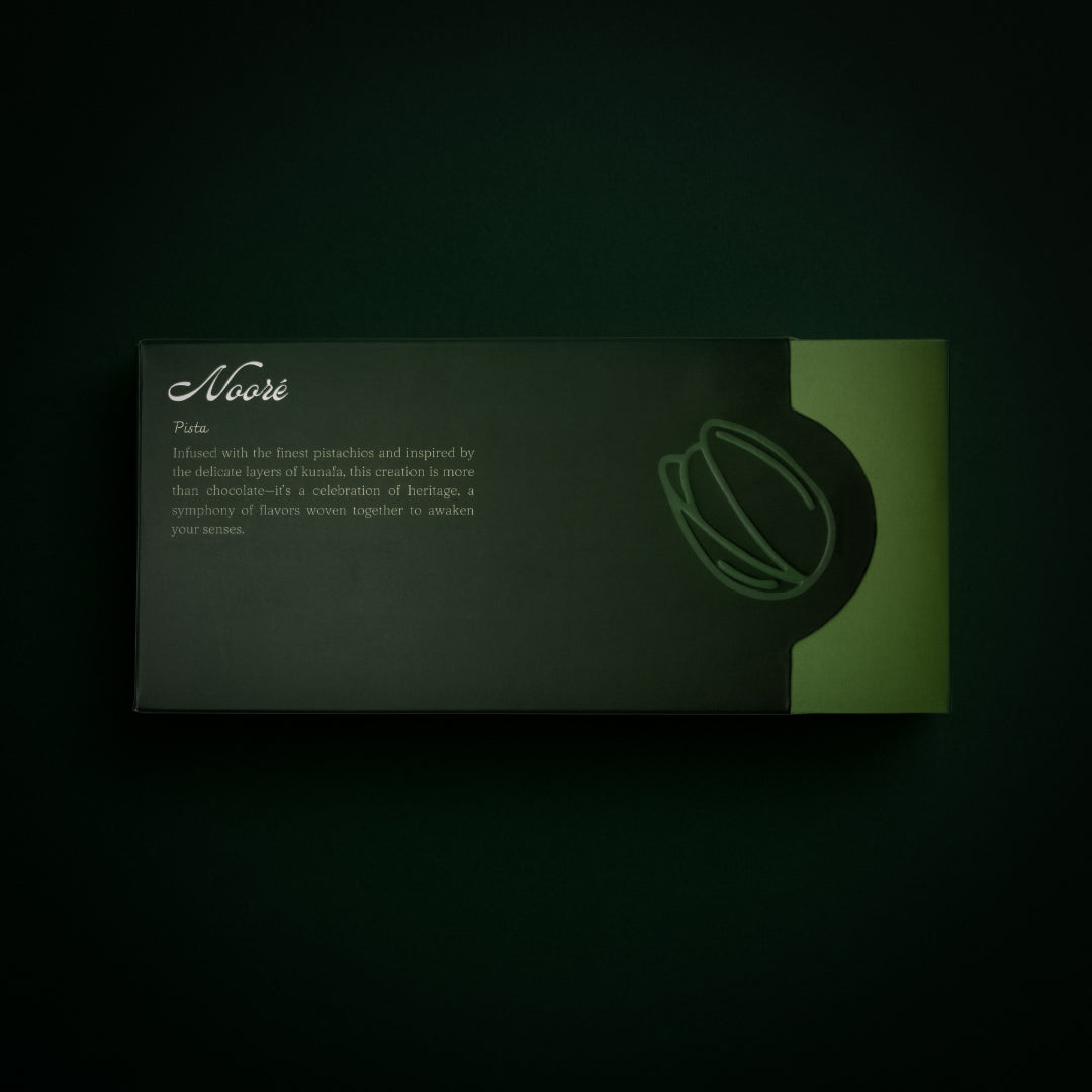 Flaky kunafa meets the essence of rose and the silk of pistachio filling, nestled in a soft milk chocolate shell made with pure cocoa butter.